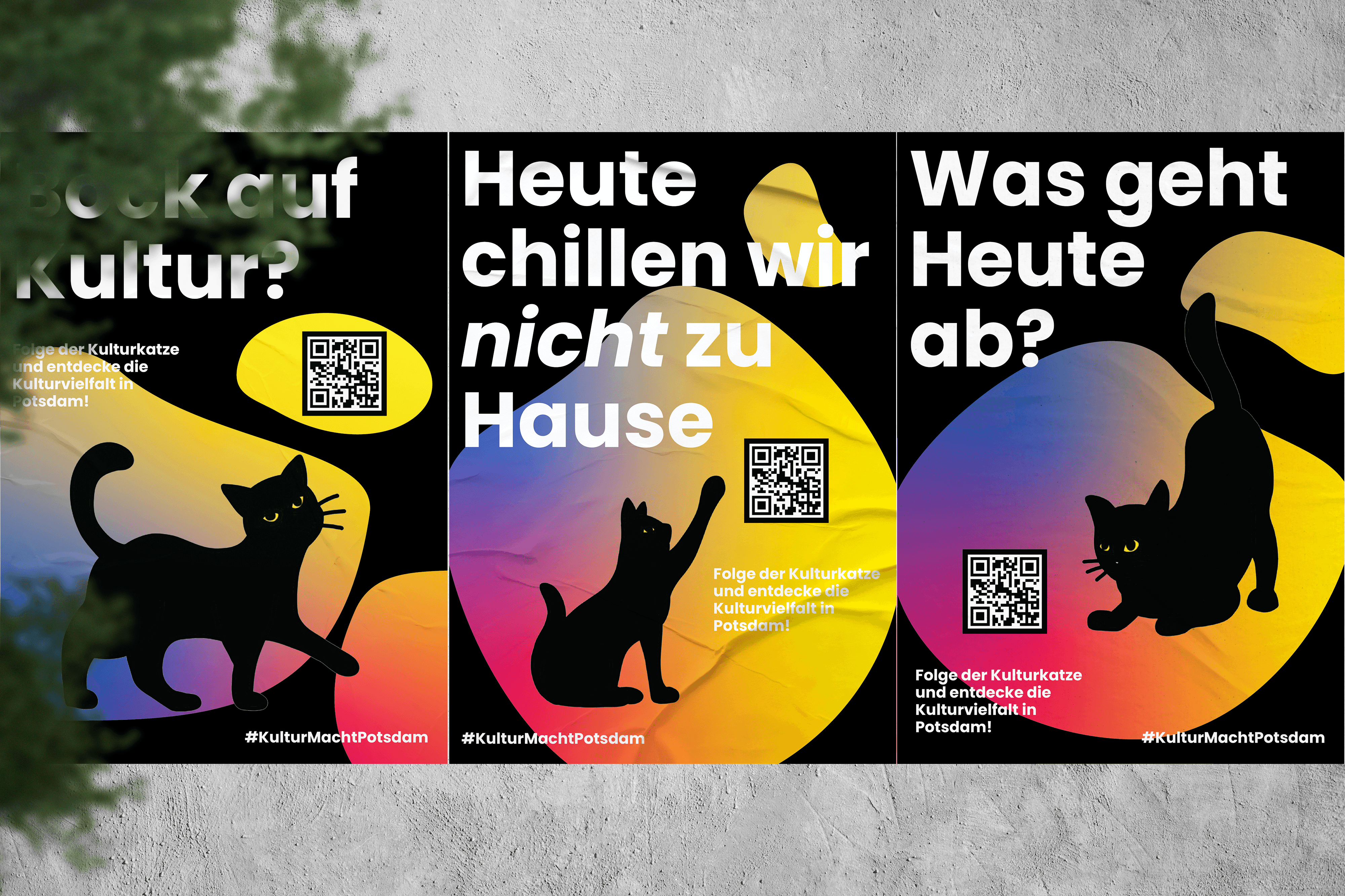 The solution for the campaign, developed by our team of four students, was called Culture Cat (Kulturkatze). The idea was to use the cat—a curious and whimsical creature that often roams independently—as a gateway to spark people’s interest in discovering cultural offerings. The QR code on the posters above was designed to lead to a website featuring a map of Potsdam’s cultural events, including theatre plays, concerts, cabaret performances, and more.