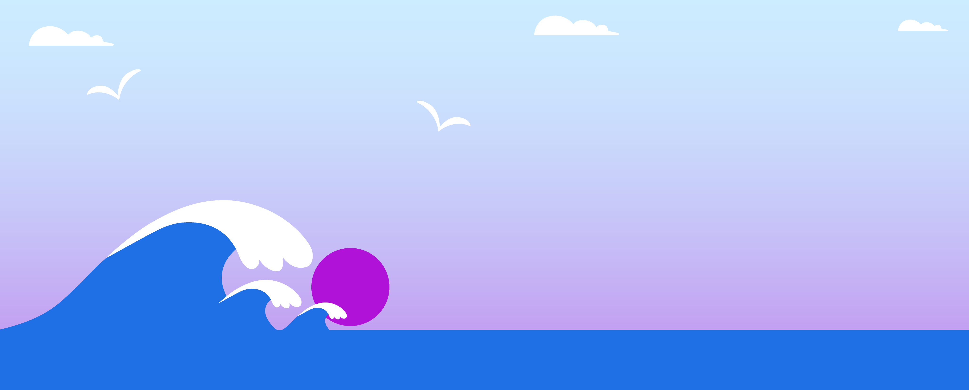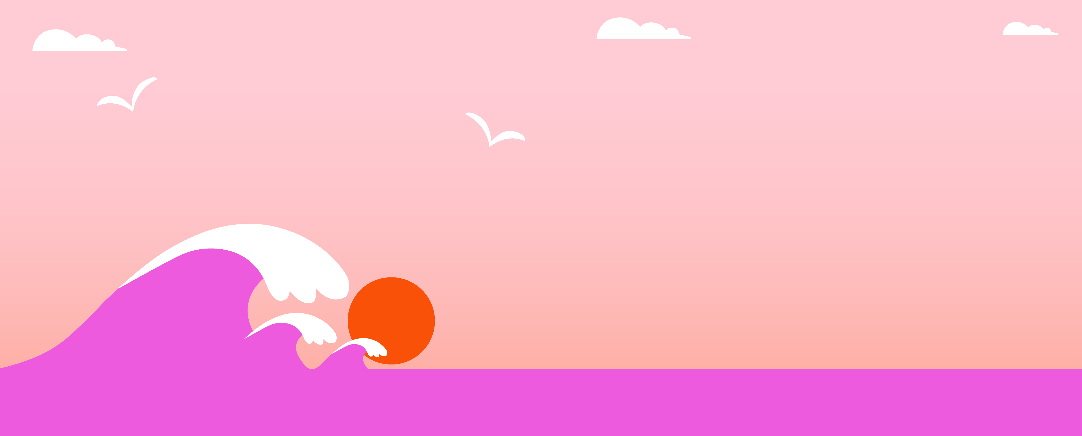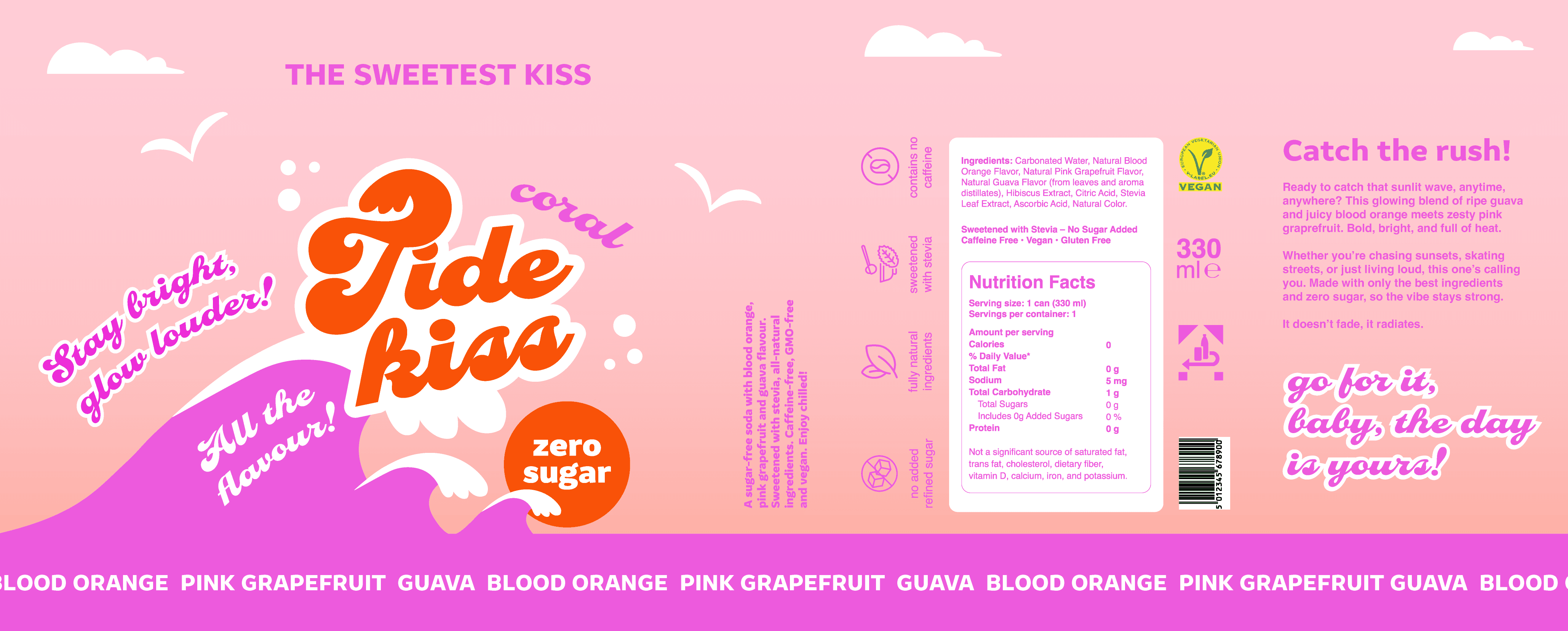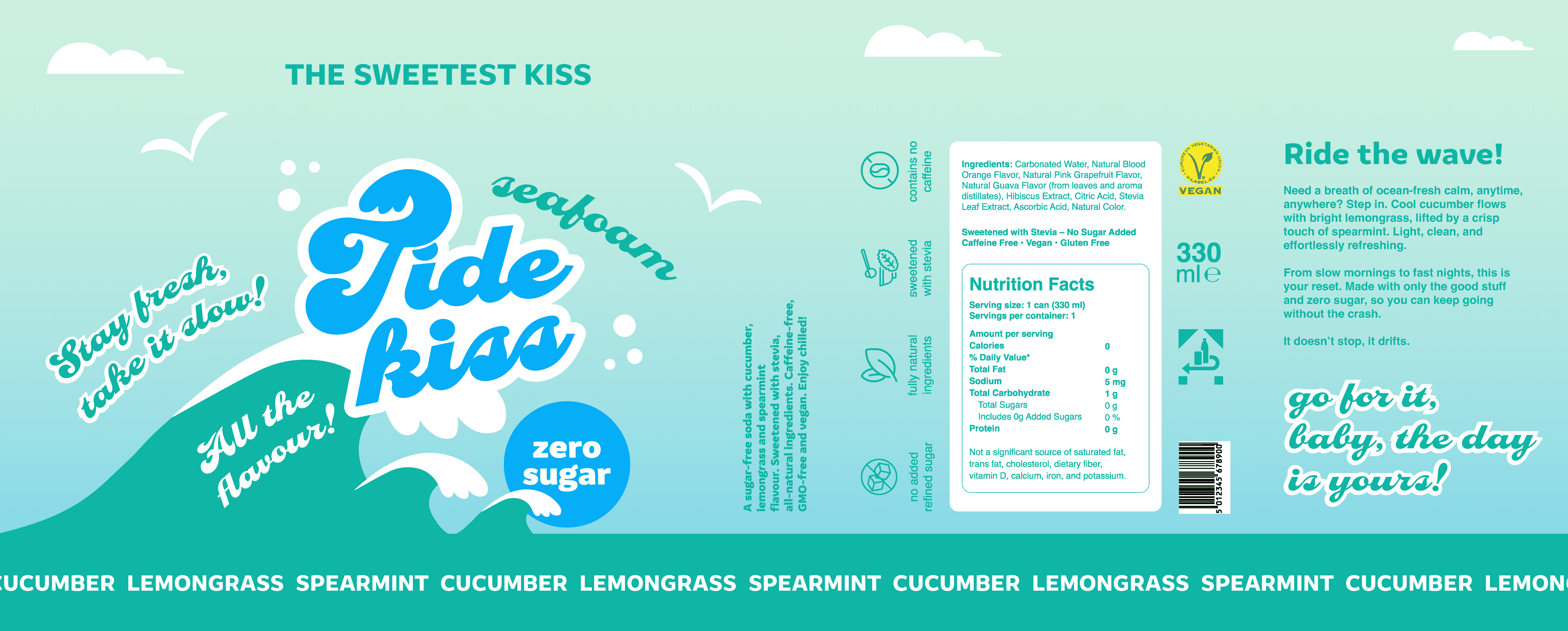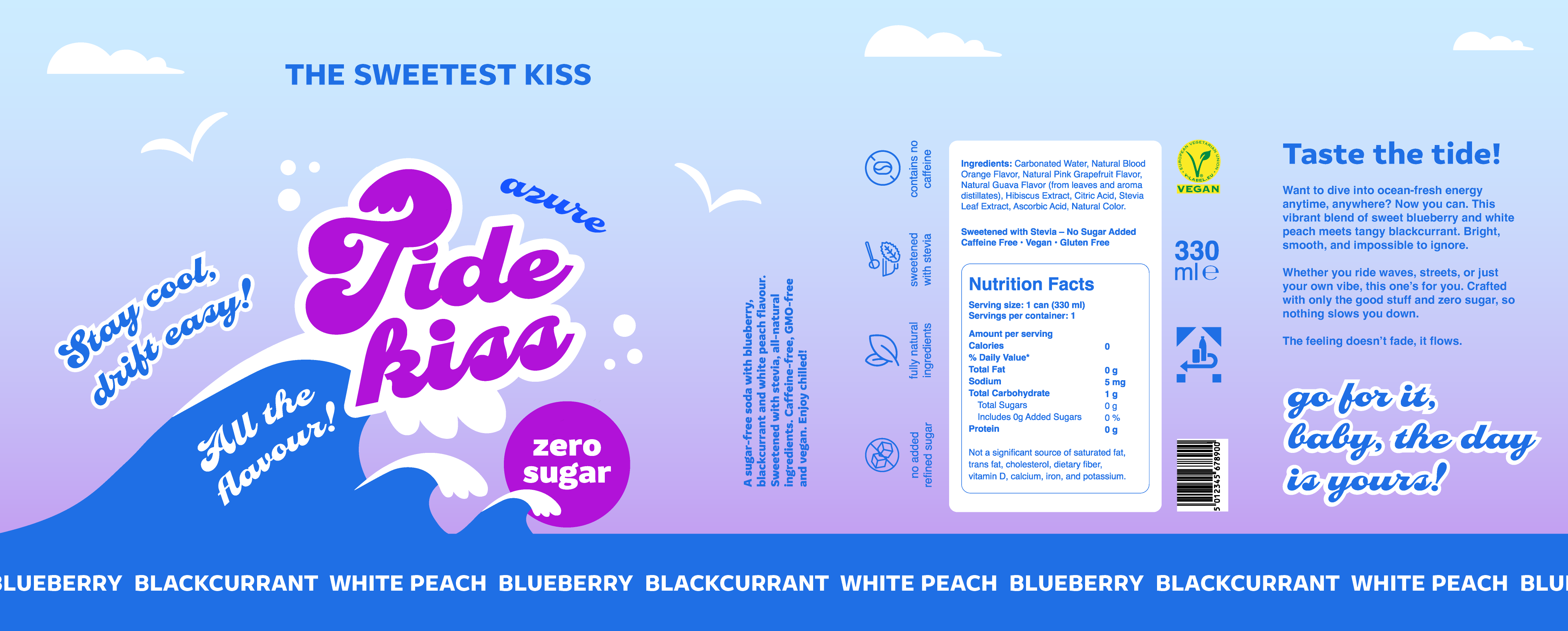 The central element to the layout design was a wave element, which is also present in the logo. Three waves are set against a gradient background, with a rising or setting sun, that carries the central message "zero sugar." A couple of clouds and seagulls complete the seascape.